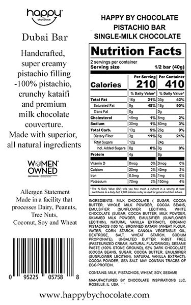 We create our own, velvety, pistachio filling- no artificial flavors or preservatives, our filling is 100% pistachio. We then add crunchy, toasted, kataifi and hand-pipe our decadent pistachio filling inside our premium milk chocolate couverture bar.
